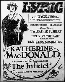 The Infidel is a 1922 American silent drama film written and directed by James Young and featuring Katherine MacDonald, Robert Ellis, Joseph Dowling and Boris Karloff. Young wrote the screenplay based on a story by Charles A. Logue. The film is considered to be lost.[1] The film's tagline was "Man-Bait! Sent out, willingly, to a Pacific Paradise where the world forgets. Sent there to wreck a two-fisted, fighting gentleman with her faithlessness... And instead wrecking her own heart with her own love." (Print Ad in the Flushing Daily Times, ((Flushing, NY)) 30 December 1922).