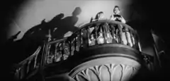 An unreliable narrator was originally intended to feature in the narrative and the film was to open with a funeral scene.[18] There are stills of the scene that circulated at the time, but Clayton ultimately elected to open the film with darkness, a song sung by a little girl, and the image of Kerr's hands that are clasped in prayer, with her rosary between her fingers, as she murmurs and sobs.[19] Gradually Kerr's face is highlighted. According to film scholar Frayling, the opening scene creates a sense of intimacy and, perhaps, trust that the governess should be trusted, but the use of darkness surrounding her suggests that it is possible that the story that follows could be nothing more than in her own mind – isolated and creating its own supernatural world.[20]