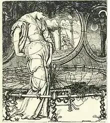 8. McMahon Bourke, Allyson (1996). "Tennyson's Lady of Shalott in Pre-Raphaelite Art". Dissertations. College of William & Mary. doi:10.21220/s2-eybx-jm55. Behind the Lady's head, a frieze of cherubs also reminds her of her female duties. An angel on the right steps with her foot upon a red serpent – just as Eve should have done. The frieze as a whole depicts the music of the spheres and indicates the social harmony that results when women observe social boundaries and serve God as they should.