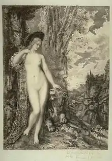 The subject also lends itself to satirical interpretation and was chosen for this purpose by the Japanese caricaturist Kawanabe Kyōsai for his Isoho Monogotari series (1870–80).[14] More recently Diane Victor has used it in her lithograph "The lion who loved the lady" (2011) to comment on the relationship between China and Africa.[15][16] In other depictions too, as in paintings by Gustave Moreau,[17] Adolphe Weisz (1838 – after 1900)[18] and Henri Courcelles-Dumont (1856–1918),[19] the woman flaunts her naked body in a show of power over the beast.