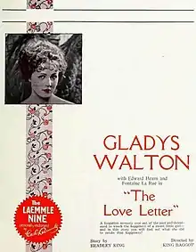 The Love Letter is a 1923 American drama film directed by King Baggot and written by Hugh Hoffman. The film stars Gladys Walton, Fontaine La Rue, George Cooper, Edward Hearn, Walt Whitman, and Alberta Lee. The film was released on February 9, 1923, by Universal Pictures.[1][2][3]
