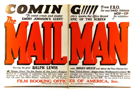 The Mailman is a 1923 American silent melodrama directed by Emory Johnson. FBO released the film in December 1923. The film's "All-Star" cast included Ralph Lewis, Johnnie Walker, and Virginia True Boardman. Emilie Johnson, Johnson's mother, wrote both the story and screenplay. The Mailman was the fourth film in Johnson's eight-picture contract with FBO.[1]