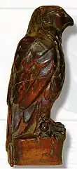 Fred Sexton, an American artist, sculpted the Maltese Falcon statuette prop for the film.[24] The "Maltese Falcon" itself was based on the "Kniphausen Hawk", a ceremonial pouring vessel made in 1697 for Georg Wilhelm von Kniphausen, Count of the Holy Roman Empire. It is modeled after a hawk perched on a rock and is encrusted with red garnets, amethysts, emeralds, and sapphires. It is currently owned by the Cavendish family[25] and is part of the collection at Chatsworth House.[26]
