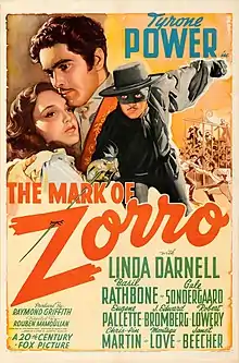 The Mark of Zorro is a 1940 American black-and-white swashbuckling film released by 20th Century-Fox, directed by Rouben Mamoulian, produced by Darryl F. Zanuck, and starring Tyrone Power, Linda Darnell, and Basil Rathbone. The supporting cast features Eugene Pallette, Gale Sondergaard, and Robert Lowery (the second actor to portray Batman on film). The film is based on the novel The Curse of Capistrano by Johnston McCulley, originally published in 1919 in five serialized installments in All-Story Weekly,[3] which introduced the masked hero Zorro; the story is set in Southern California during the early 19th century. After the enormous success of the silent 1920 film adaptation, the novel was republished under that name by Grosset & Dunlap. The Mark of Zorro was nominated for an Academy Award for Best Original Score. The film was named to the National Film Registry in 2009 by the Library of Congress for being "culturally, historically or aesthetically significant", and to be preserved for all time.[4]