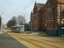The Queens Walk NET tram-stop with a tram heading to Clifton South
