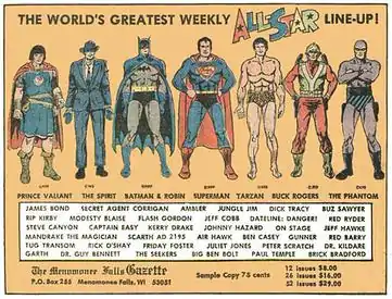 The Menomonee Falls Gazette (subtitled "The international newspaper for comic art fans") was a weekly tabloid published in the 1970s by Street Enterprises that reprinted newspaper comic strips from the United States and the U.K. Comic strips reprinted in this publication normally fell into the adventure and soap opera category. (Humor strips were collected in a sister publication, The Menomonee Falls Guardian.)[3] Typically, a full week's worth of a particular strip was collected on a single page of The Gazette. Although The Gazette was available via newsstand distribution, the bulk of their sales came from subscriptions.