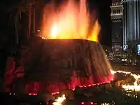 In 2005, the design firm WET was hired to begin planning an upgrade of the volcano.[56][58] The company spent two years developing a fire-shooting device for the revamped volcano.[139] It closed in February 2008, to allow for the $25 million upgrade to take place.[140] The volcanic structure, made of steel, was stripped down to receive a new exterior.[141] It reopened at the end of the year. The improved volcano shoots water 12 feet (3.7 m) high, while 120 flamethrower devices spout out flames on the lagoon. The attraction is choreographed to music by Mickey Hart and Zakir Hussain.[142][143] WET's redesign was inspired by the Fountains of Bellagio, another choreographed attraction by the company.[139]