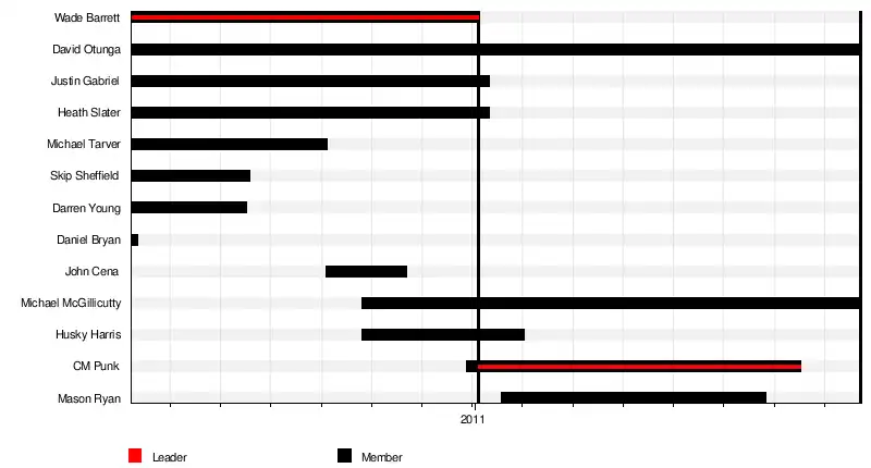 On the February 2, 2010 edition of ECW, WWE Chairman Vince McMahon announced that NXT would replace ECW on Syfy when the latter ends its run on February 16, describing NXT as "the next evolution of WWE television history."[1] The concept of the stable was derived from each original member of them being a contestant on the first season of the NXT program, which composed at the time of the talent from WWE's developmental territory Florida Championship Wrestling. The series ran them through a competition to become WWE's next breakout star with the help of mentors from WWE's Raw and SmackDown brands.[2][3] On the June 1, 2010 edition of NXT, Barrett was declared the winner over Otunga and — as a result — was awarded a WWE contract and a championship match at a WWE pay-per-view of his choosing (he ultimately chose Night of Champions), while the others were left without a job.[4]