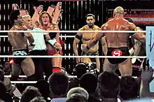On the January 3, 2011 edition of Raw, The Nexus ambiguously announced after months of repeated attacks on Cena and the WWE roster that it was under "new management," with Punk (who disbanded the Straight Edge Society the previous September) being revealed to be the new leader, acquiring the position after Barrett lost a #1 contendership steel cage match involving Orton and Sheamus. Punk, having agreed to fall in line had Barrett successfully won the title shot, teased helping Barrett escape the cage before knocking him off of it. Barrett was subsequently exiled from The Nexus, which would be renamed "The New Nexus" to distance itself from former leadership.[34] After refusing to follow Punk's orders of initiation by hitting each other with kendo sticks, Gabriel and Slater left the group the following week on Raw, opting to join Barrett and former ECW Champion Ezekiel Jackson on SmackDown as The Corre while Harris, McGillicutty and Otunga successfully completed Punk's initiation.[35] On the January 17, 2011 edition of Raw, Mason Ryan joined The New Nexus after interfering in Punk's match against Cena, attacking both before Punk handed Ryan a Nexus armband.[36] On January 30, 2011 at the Royal Rumble, The New Nexus, who were also a part of the 40-man Royal Rumble match along with The Corre, cost Orton his rematch clause for Miz's WWE Championship, starting a feud with him.[37] Over the ongoing weeks, Orton defeated all members of The New Nexus, causing several storyline injuries by punting them.[38][39][40][41] At WrestleMania XXVII, Orton defeated Punk and, at Extreme Rules, Orton defeated Punk in a Last Man Standing rematch.[42][43] On the May 23, 2011 edition of Raw, thanks to a distraction from The New Nexus, McGillicutty and Otunga defeated Big Show and Kane for the WWE Tag Team Championship.[44] On the June 20, 2011 "Power to the People" edition of Raw, Punk was originally going to be named the number one contender for Cena's WWE Championship, but instead, he was forced to compete in a triple threat match with Alberto Del Rio and Rey Mysterio with a Falls Count Anywhere stipulation voted for by fans which Punk won, revealing after the match that his WWE contract would expire at Money in the Bank, where he would face Cena for the WWE Championship.[45] The following week on Raw, it was announced that Ryan suffered an injury over the weekend and left the group.[46] That same night, a brash Punk realized a worked shoot promo (which he dubbed a "pipe bomb"), reminding that once his contract expired at Money in the Bank, that would be the last time WWE would ever see him and the WWE Championship, as he considered taking his talents to another wrestling promotion, like Ring of Honor and New Japan Pro-Wrestling.[47] With his victory over Cena at Money in the Bank, the WWE Championship was finally held by the stable on their last night of existence.[48]