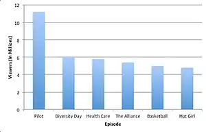 The first episode of The Office scored well in ratings, gaining over eleven million viewers, as well as ranking third in its timeslot on the night of its airing.[14][15] But the episode aired on a Thursday evening, and between the change from the first episode and the second episode, The Office moved to its regular time slot on Tuesday evenings. The Office tumbled in the ratings, averaging under 6.0 million viewers, just over half that of the previous episode.[16][17] The first-season finale "Hot Girl" received one of the lowest ratings in the show's history, earning just a 2.2 rating with a 10 share.[18] After the lackluster reception of the episode, many critics erroneously predicted that "Hot Girl" would also serve as the de facto series finale.[18] The Office averaged 5.4 million viewers for its entire season, ranking it #102 for the 2004–2005 U.S. television season.[19]