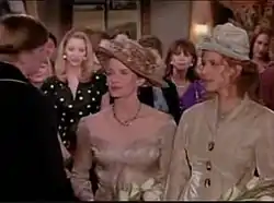 While this episode of Friends was one of the first mainstream portrayals of gay marriage on U.S. television, it was actually the second gay marriage on a sitcom. Roseanne had aired an episode just five weeks before called "December Bride" in which the title character coordinated and attended a wedding for her co-worker Leon and his partner Scott. The New York Times claimed, "The biggest news about the wedding on Friends was that it was almost no news at all." However, the fact that Carol and Susan's ceremony was officiated by Candace Gingrich, a gay-rights activist and sibling to conservative Speaker of the House of Representatives Newt Gingrich did draw some media attention, as the casting was perceived as a comment on the Republican Party's anti-gay rights stance and the "Contract with America" platform.[1] A writer with the Associated Press noted in an article that week that the ceremony would not include a kiss by the newlyweds, including the episode as part of an observed trend of portrayals of gay characters while skirting controversy by avoiding or minimizing physical contact.[3]