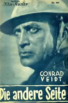 The Other Side (German: Die andere Seite) is a 1931 German war film directed by Heinz Paul and starring Conrad Veidt, Theodor Loos and Friedrich Ettel. It is an adaptation of R.C. Sherriff's 1928 First World War play Journey's End which had been turned into a British-American film the previous year. Paul's film attempted to be faithful to the play, retaining the British setting rather than switching the story to feature German soldiers and going to great lengths to portray the "Britishness" of the characters.[1] The film was positively received on its release.[2] It was shot at the Johannisthal Studios in Berlin. The film's sets were designed by the art director Robert A. Dietrich.