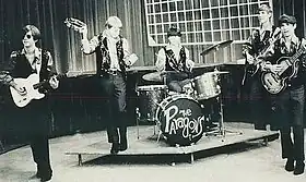 Worried about the possibility that using a controversial moniker might cause the band to lose church gigs and elsewhere, the group decided to change their name from the Pagans to the Paragons.[6] Bobby and Johnny Pace's mother helped them find the new name when looking in a thesaurus and noticing the word "paragon" not far below "pagan" on the page.[6] The band voted to use that as their new name.[6] The Paragons would use the recreation room located in a small house in the backyard of Mr. and Mrs Paces' house for rehearsals.[4][7] It had a pool table and everyone called it "the pool house."[1][7] Le Roy Pace, Bobby and Johnny's father was a TV repairman who moved the band's equipment around in his Ford truck.[7] The band eventually purchased a used hearse.[8] Danny Huntley was the oldest member of the group and had a driver's license, so he operated the vehicle.[9] Like many other bands in the Charlotte area, they bought instruments from Reliable Music, a music store selling new instruments run by Melvin Cohen that was located in the back of a pawn shop owned by his father.[10] The Paragons played at several local teen clubs such as the Spyder (located at the YMCA in Charlotte), the Straggle Inn (at Myers Park Methodist Church) and the Tin Can (at Christ Episcopal Church), and the Web.[1][11] The group occasionally played at the Park Road Shopping Center and on other occasions the local National Guard armory.[1][4][12] The Paragons quickly became one of the most popular bands in the Charlotte area, making strong impressions at various battles of the bands in 1966, such as one sponsored by radio station WAYS and another held at the Charlotte Coliseum.[1][13] The song "Abba" now figured prominently in the band's performances.[14] Other popular bands in the area were the Barons, whose membership included future member of the Paragons Pat Walters on guitar, and the Young Ages, the Hodads, and the Die Hards, who sometimes played at some of the same venues, as well as the Grifs, the Stoaways, and T.C. Atlantic (not to be confused with the Minnesota band of the same name.[1][15] The Tamrons, from Concord were another competitor.[16] Jim Charles eventually left the group and returned to the Abbadons, following a personal dispute with Bobby Pace over a girlfriend.[1][17]