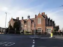 In 1976, with the removal of the Direct Grant, it stopped being a grammar school under the Tripartite System, though kept the term as part of its name, and at the same time began to accept female pupils.[5] The Upper Junior School (Years 5–6) is situated in the original Victorian building which once contained the whole Grammar School. The Nursery, Lower Junior School (Reception to Year 4), Middle School and Upper School are located across the road on the High Street. The school colours are red, black and gold, and the school motto is Praemia Virtutis Honores (English: Honours are the rewards of virtue). The current Headmaster is Mr David Wickes, replacing Dr Anne Cotton. The school spent £6 million on a new Science building in 2011.[6]