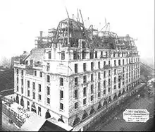 Excavation for the hotel began by contractors Waring White Building Co. Ltd in June 1904, and it was completed by 1 October 1905, and opened the following May.[95] The building progress was documented each month by The Builder's Journal and Architectural Engineer, and in one edition noted the difficulties of some of the aspects of construction such as hoisting 20-ton 39 feet (12 m) steel joists in a narrow building site. The Architect and Contract Reporter noted that the limited space did not allow for the storage of materials on site. All mortar had to be mixed in the basement and the stone was dressed "on a platform with a watertight roof over the footway".[96] The red-brick foundations of the earlier Walsingham House had to be blasted away to facilitate the foundations of the steel structure in concrete.[97][lower-alpha 13]