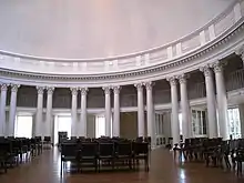 In 2012, the university began an extensive construction project to repair and renovate the aging Rotunda.[14] The first phase of the project replaced the Rotunda's copper roof. Although the engineers were several months ahead of schedule, the roof remained as unpainted copper for the graduating class of 2013.[15] During the renovation, a nineteenth-century chemistry laboratory was found within the walls on the bottom floor featuring a chemical hearth and a sophisticated ventilation system through a series of brick tunnels.[16] The Rotunda reopened in September 2016.[17]