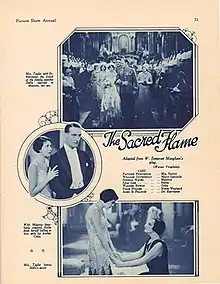 The Sacred Flame is a 1929 film directed by Archie Mayo, starring Pauline Frederick and Conrad Nagel, and based on a 1928 Broadway play of the same title by Somerset Maugham.[1] It is now considered a lost film.[2] Two years later Warner Brothers remade the film in German The Sacred Flame. In 1935, a second remake The Right to Live, was made, starring Colin Clive and George Brent.