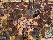 Whether playing in single-player or multiplayer mode, each game begins roughly the same way; the player is positioned at a set location on the map, with three prebuilt "Special Buildings"; the Castle, the Cathedral, and the Storehouse and accompanying marketplace.[20][21] The Castle determines the upper limit of soldiers, is where the player's knight heals if injured, and is where the player sets the tax rate and soldiers' salary.[20] The Cathedral determines the upper limit of settlers. Sermons can also be called here, which generate income, and temporarily raise the city's reputation.[22] The Storehouse is where raw materials are stored and where traders collect items to make their produce. Trade with other settlements is conducted from the Storehouse.[23] Attached to the Storehouse is the Marketplace, where the player can organise festivals.[16][23] When the player calls for a festival, a certain number of male settlers will attend. At the same time, women will emerge from the Storehouse. If a man and woman are attracted to one another, they will talk, then dance, and subsequently become a couple. When the festival is over, the woman will return with the man to his place of work. Women acquire more food and take care of cleaning, thus giving men more time to work, which increases productivity.[24]