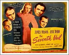 The Seventh Veil is a 1945 British melodrama film directed by Compton Bennett and starring James Mason and Ann Todd. It was made by Ortus Films (a company established by producer Sydney Box) and released through General Film Distributors in the UK and Universal Pictures in the United States. The screenplay concerns Francesca (Todd), a brilliant concert pianist who attempts suicide while she is being treated for a disabling delusional disorder centered on her hands that makes it impossible for her to play. A psychiatrist uses hypnosis to uncover the source of her crippling fear and to reveal, one by one, the relationships that have enriched and troubled her life. When the last “veil” is removed, her mind is clear. She regains the ability to play and knows whom she loves best. The film's title comes from the metaphor, attributed to the fictional psychiatrist, that while Salome removed all her veils willingly, human beings fiercely protect the seventh and last veil that hides their deepest secrets, and will only reveal themselves completely under narcosis.
