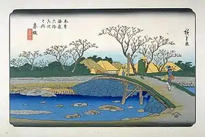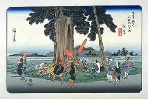 The Sixty-nine Stations of the Kisokaidō (木曾街道六十九次, Kisokaidō Rokujūkyū-tsugi) or Sixty-nine Stations of the Kiso Road, is a series of ukiyo-e works created by Utagawa Hiroshige and Keisai Eisen. There are 71 total prints in the series (one for each of the 69 post stations and Nihonbashi; Nakatsugawa-juku has two prints).