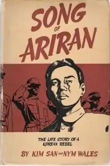 Song of Ariran (New York: John Day 1941) is a book of reportage by an American journalist, Helen Foster Snow under the name Nym Wales. Snow traveled to Yan'an, the wartime capital of the Chinese Communist Party, which welcomed and supported many Koreans in the fight for independence from Japan. The colorful and personal information on the history of the Korean independence movement and the Chinese Communist movement in the 1930s is based on extensive interviews with a Korean communist Jang Jirak (장지락) who is called Kim San (김산) in the book.[1]