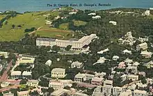 The hotel was constructed on Rose Hill overlooking the town of St. George and was opened in 1906. It had over 100 rooms and served as a winter tourist destination featuring "extensive grounds, private baths, luxurious furnishings, sun parlors, spacious verandas, large ballroom, orchestra, tennis and golf"[1] Next to the hotel was the bar the "Sea Venture" built in the shape of a ship. The hotel was renovated and expanded over the years, including a new wing, and one of the largest indoor swimming pools in Bermuda.[2][3] The hotel had a golf course and a beach club at Achilles Bay.