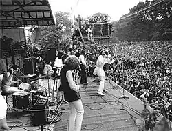 Fans started to arrive at the park with candles on 4 July in tribute to Jones, and the police allowed the park to be opened late so they could stay.[14] By the following morning, there were already 7,000 people.[15]: 323 As with the Stones' performance at the infamous Altamont Free Concert later that year, the Hells Angels were hired as stewards to protect the stage and equipment,[2] something suggested by the Grateful Dead's manager Rock Scully, who was used to the Angels performing this service at free festivals in California.[12] According to Cutler, Jagger said that he was keen on doing a similar free concert in California at some time in the future.[12] At Hyde Park, fifty Angels patrolled the vicinity of the stage, though there was little resemblance other than a superficial one to their American counterparts. They performed their duties in exchange for a cup of tea.[12] In the event, there were only twelve arrests on the day and a subsequent police report claimed that the Angels were "totally ineffective".[12]