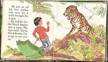 Contemporary critics observed that Bannerman presented one of the first black heroes in children's literature and regarded the book as positively portraying black characters in both the text and pictures, especially in comparison to books of that era that depicted black people as simple and uncivilised.[1] However, it became an object of allegations of racism in the mid-20th century due to the names of the characters being racial slurs for dark-skinned people, and the fact that the illustrations were, as Langston Hughes expressed it, in the pickaninny style.[2] In more recent editions, both text and illustrations have undergone considerable revision.