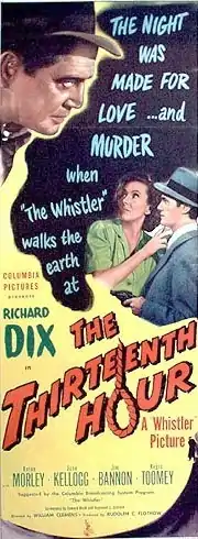 The Thirteenth Hour is a 1947 American mystery film noir based on the radio drama The Whistler. Directed by William Clemens, the production features Richard Dix, Karen Morley and John Kellogg.[1] It is the seventh of Columbia Pictures' eight "Whistler" films produced in the 1940s. This was the last of Dix's seven starring roles in the series, and one of only two that featured him in a sympathetic light.[2] Suffering from heart disease, Dix was unable to continue his acting career and died in September 1949 at the age of 56.