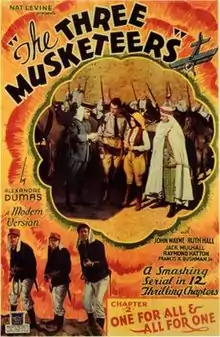 The Three Musketeers is a 1933 American pre-Code film serial directed by Armand Schaeffer and Colbert Clark, and produced by Nat Levine for Mascot Pictures.[1] The film serial was very loosely based on Alexandre Dumas' 1844 novel The Three Musketeers, with the musketeers changed into three soldiers in the French Foreign Legion, and d'Artagnan being reconfigured as Lt. Tom Wayne (played by John Wayne), a pilot in the United States military.[2][3]