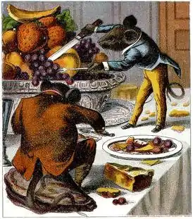 In the original tale, a proud town mouse visits his cousin in the country. The country mouse offers the city mouse a meal of simple country cuisine, at which the visitor scoffs and invites the country mouse back to the city for a taste of the "fine life" and the two cousins dine on white bread and other fine foods. But their rich feast is interrupted by a cat which forces the rodent cousins to abandon their meal and retreat back into their mouse hole for safety. The town mouse tells the country mouse that the cat killed his mother and father and that he is frequently the target of attacks. After hearing this, the country mouse decides to return home, preferring security to opulence or, as the 13th-century preacher Odo of Cheriton phrased it, "I'd rather gnaw a bean than be gnawed by continual fear".[3][4]