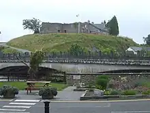 The violence that broke out in the city on 18 June continued for a week.[28] At least nineteen people were killed or fatally wounded during this time: 14 Catholics and five Protestants.[29] On 18 June, rioting had spread into the mainly-Protestant Waterside area of the city, where Catholic homes were burnt. The UVF, with the aid of ex-servicemen, seized control of the Guildhall and Diamond, whilst also repulsing an IRA counter-attack. Protestants living in the mainly-Catholic Bogside would be burnt out of their houses by the IRA, with two shot dead.[25] Loyalists fired from the Fountain neighborhood into adjoining Catholic streets.[30] The IRA, armed with rifles and machine-guns, occupied St Columb's College, which became the scene of intense gunfire.[29][30]
