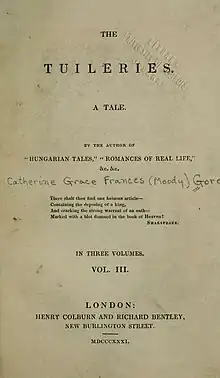 The Tuileries is an 1831 novel by the British writer Catherine Gore.[1] A bestselling writer of silver fork novels, Gore turned in this to the recent history of Paris following the French Revolution and particularly the Tuileries Palace. Gore herself had a low opinion of the work and when her publisher Richard Bentley asked her to write a review of itshe declined observing it was "a very dull work" and that she "could find little to say its favour" concluding that "the public must be more dense than I dare hope, if they can be persuaded that it is really a work of interest".[2] It was one of two novels that Mary Shelley sent for in May 1831 along with Benjamin Disraeli's The Young Duke.[3]