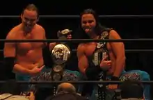The Young Bucks made their debut for Dragon Gate (DG) in Tokyo, Japan at the Korakuen Hall on May 14, 2008, in a match where they were defeated by Susumu Yokosuka and Ryo Saito.[69] Their first tour of the company spanned from May 14 to June 14.[70] Their second tour started on August 9, 2008, and ended on August 28, 2008.[71] On September 5, 2008, the Young Bucks took part in Dragon Gate's first show in the United States, held in Los Angeles, California, where they unsuccessfully challenged Saito and Yokosuka for the Open the Twin Gate Championship.[72] Their third tour spanned from April 15 to May 5, 2009.[73][74] On May 3, 2009, in Kanazawa, Ishikawa, Matt and Nick successfully defended their PWG World Tag Team titles against Shingo Takagi and Akira Tozawa, the first time the titles had been defended in Japan.[75][76] On May 5, 2009, in Aichi, Japan at the Dead or Alive pay-per-view, The Young Bucks and Ryoma teamed up in a losing effort against Akira Tozawa, Kenshin Chikano and Anthony W. Mori.[74]
