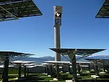 The three rows of heliostats furthest away from the tower are having their mirrors replaced by solar cells. Of these cells, some will follow the sun while others will not, so as to measure the difference in efficiency.