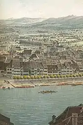 Back then, the center of Kleinbasel was the “Pond” (German: Teich), a network of canals with water from the river Wiese that was used for commercial purposes. It was used by sawmills, dye works and fulling mills, by tanners and millers, for gypsum mills, tobacco mills and others. In 1823, the canals drove a total of 64 wheels, 34 of which were grain mills.[2] They were heavily polluted by sewage and faeces. Kleinbasel's "Pond" was filled in between 1907 and 1917. The “Teichgässlein” (“Pond Alley“) between Claragraben and Ochsengasse still recalls this pond today.
