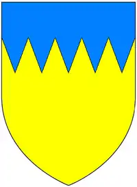 ![]() Arms of Walter, adopted at the start of the age of heraldry: Or, a chief indented azure. These arms are borne in the first quarter of the arms of the Butler family, Marquess of Ormonde (the arms of Butler are born in the 2nd) reflecting that family's descent in the male line from Theobald Walter[1] | |