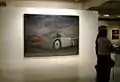 Pištěk's conceptual installation of sacred objects in the former riding school in Hluboká nad Vltavou had a dramatic gradation and scope, and within the context of postmodern scepticism it offered an updating of the psychological values of collectively valid myths.[18] On an altar in the foreground, which he titled Homage to Böcklin’s “Centaur Watching Fish”,[19] he placed the scoop of an excavator arching over a fish in a glass sphere. At the head of the riding school he installed an altar painting with an illusionistic landscape in the Baroque style, to which he added brightly coloured geometrical forms that quoted the American postmodernist Frank Stella. In front of this painting was a pyramid with a pile of refuse that was titled Reliquary. The side altars, hidden in a labyrinth, depicted the Crucifixion as the hanging chassis of a racing car and the Visitation made of an old petrol pump, with car doors as the angel's wings. According to Jiří Šetlík, Pištěk's subjective interpretation of our sick world unmasks our faith in consumerist idols.[20]