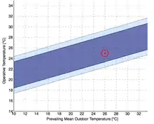 The adaptive model is based on the idea that outdoor climate influences indoor comfort because humans can adapt to different temperatures during different times of the year. The adaptive hypothesis predicts that contextual factors, such as having access to environmental controls, and past thermal history can influence building occupants' thermal expectations and preferences.[3] Numerous researchers have conducted field studies worldwide in which they survey building occupants about their thermal comfort while taking simultaneous environmental measurements. Analyzing a database of results from 160 of these buildings revealed that occupants of naturally ventilated buildings accept and even prefer a wider range of temperatures than their counterparts in sealed, air-conditioned buildings because their preferred temperature depends on outdoor conditions.[3] These results were incorporated in the ASHRAE 55-2004 standard as the adaptive comfort model. The adaptive chart relates indoor comfort temperature to prevailing outdoor temperature and defines zones of 80% and 90% satisfaction.[1]