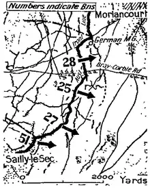 The Australians advanced under a creeping barrage that lifted at a rate of 100 yards (91 m) every two minutes, with officers controlling the rate of advance to prevent the soldiers being shelled by their own artillery. Nevertheless, some casualties were experienced amongst the 27th Battalion, on the right of the line, when supporting artillery showered assault troops with shrapnel as they moved through the advanced part of their trench line prior to going over the top.[20] About 20 Australians from the 25th Battalion were also hit by shrapnel south of the Bray–Corbie Road after advancing into the supporting barrage due to over eagerness.[21] Heavy machine gun fire was laid down by the defenders, but in places this lacked support as the Allied bombardment forced the defending infantry to remain in their trenches, while others hastily withdrew. Resistance was strongest in the 27th Battalion's sector. As the assault developed, the defence grew more stubborn across the front as the Germans reorganised.[22] This resistance was overwhelmed and by 22:00 hours the 7th Brigade had reached its objective;[5] green flares were fired to signal the success.[23] Elsewhere, on the extreme right of the Australian position, the 51st Battalion, assigned to the 4th Division carried out a supporting attack against the 107th Reserve Infantry Regiment, to link in with the 2nd Division's gains, and provide protection to its flank.[24]