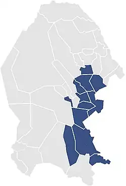 Under the 2005 districting scheme, Coahuila's Second District is located in the central-eastern portion of the state and covers the municipalities of Abasolo, Arteaga, Candela, Castaños, Escobedo, General Cepeda, Juárez, Monclova, Progreso, Ramos Arizpe, Sabinas and Sacramento.[1]