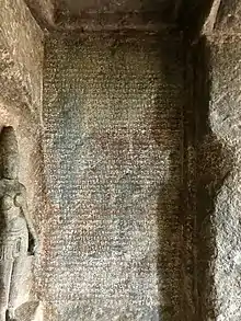 Inside is a mandapam that is 20.2 feet (6.2 m) by 7.7 feet (2.3 m), an unusual size suggesting a likely expansion with two or more stages of construction. The mandapam's northern wall has two badly damaged panels, both minimalist with no background ornaments or decorative reliefs, but with all the essential iconography. One with carvings of Nataraja Shiva and his family members, another which has been interpreted as Skanda or a king with two wives.[1] On the other walls of the mandapam are two major, long inscriptions predominantly in Tamil language and Vatteluttu script, with some Sanskrit in Grantha script.[1][5]