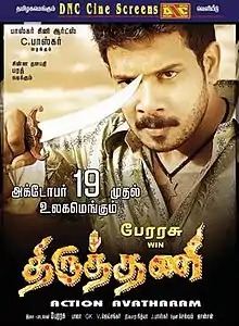 Thiruthani: Action Avathaaram is a 2012 Indian Tamil-language vigilante action film written and directed by Perarasu, who has also composed the soundtrack and background score. The film stars Bharath and Sunaina in the lead roles, while Rajkiran, Pandiarajan and Ashish Vidyarthi play other pivotal roles. The cinematography was handled by K. Bala while V. Jaishankar handles the editing.[2]