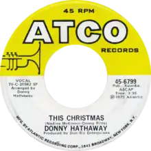 "This Christmas" is a song by American soul musician Donny Hathaway released in 1970 by Atco Records.[2] The song gained renewed popularity when it was included in 1991 on Atco Records' revised edition of their 1968 Soul Christmas compilation album[3] and has since become a modern Christmas standard, with the American Society of Composers, Authors and Publishers reporting that it was the 30th most-performed holiday song of all time.[4]
