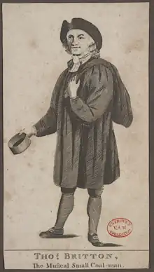 Britton's knowledge of literature and the arts became well known, and his modest and honest nature and acceptance of his social position was often noted. These were qualities appreciated by contemporaries who considered themselves socially superior. His concerts became regarded as the premier venue for chamber music in London, with an audience drawn from a wide social strata.[4] At first, concerts were free, but Britton later requested an annual subscription of ten shillings, considered exceptionally low even at the time.[3] By 1712, Ralph Thoresby was able to note: "In our way home called at Mr. Britton's, the noted small-coal man, where we heard a noble concert of music, vocal and instrumental, the best in town, which for many years past he has had weekly for his own entertainment, and of the gentry, &c., gratis, to which most foreigners of distinction, for the fancy of it, occasionally resort."[4]