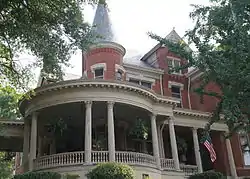 It is a Victorian house sitting among a row of Greek Revival mansions. It has a series of gables and chimneys, and a round tower topped with a wrought iron finial and skirted with a porch. It features stained glass and terra cotta trim typical of Queen Ann style architecture, and has been called "one of the finest Queen Anne type houses anywhere in the country."[2]: 4 There is a carriage house to the rear of the main house.[2]
