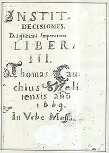 Little is known about the private life of Thomas Cauchi. Neither his dates of birth and death nor his birthplace in Malta are identified as yet. He might have lectured at the Collegium Melitense see in Valletta. He surely lectured in Messina, Sicily. Unfortunately, most of the works of Cauchi are as yet lost. At least three are known to have existed, all dealing with the philosophy of law. Of these just one is still extant, which is the third volume of what is thought to have been a triad.[1] Unfortunately, no known portrait of Cauchi is known to exist yet.
