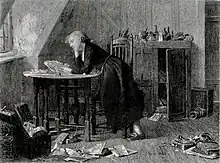 A few days later, one Dr Thomas Fry came to London with the intention of giving financial support to the young boy "whether discoverer or author merely."[25] A fragment, probably one of the last pieces written by the poet, was put together by Dr Fry from the shreds of paper that covered the floor of Chatterton's attic on the morning of 25 August 1770. The would-be patron of the poet had an eye for literary forgeries, and purchased the scraps that the poet's landlady, Mrs Angel, swept into a box, cherishing the hope of discovering a suicide note among the pieces.[26] This fragment, possibly one of the remnants of Chatterton's very last literary efforts, was identified by Dr Fry to be a modified ending of the poet's tragical interlude Aella.[27] The fragment is now in the possession of Bristol Public Library and Art Gallery.