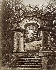 One of Child's most significant contributions to both 19th-century photography and the study of Chinese architecture and history are his photographs of Yuanmingyuan – known in English as the Old Summer Palace – one of the most potent symbols of China's past.[12] Child's images are among the earliest and most important photographic evidence of particular features at the significant historical site.[13] Child's photograph of the Prince's Porch is of particular importance. It is the only known photographic record of this architectural masterpiece.[13] Additional sites that Child photographed such as the Xiyang Lou and the Fountain Gate would be further destroyed in the Boxer War and subsequent conflicts.[14]