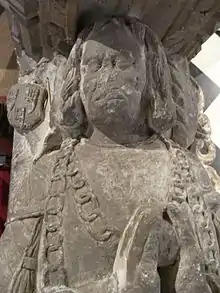 His recumbent effigy is shown fully armed in a suit of Almain rivets and his feet rest on a dog. His hair is of chin-length and his hands are clasped in prayer holding a ball shaped object, his heart according to Roger Granville, Rector of Bideford and the family's historian, who described the monument in detail in 1895.[1]